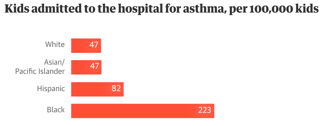 Black families tend to live in these polluted areas at much higher rates than White families. According to Quartz, more than half of the 9 million people living near hazardous waste sites are people of color, and Black Americans are three times more likely to die from exposure to air pollutants than White Americans. Latinx children are twice as likely to die from asthma than White children. This inequality is so prevalent that The Guardian launched an entire series on Environmental racism to highlight America’s dirty divide. It is also important to note that these facilities are often built intentionally in minority neighborhoods — it isn’t only the case that White families move away. A University of Michigan study found “a consistent pattern over a 30-year period of placing hazardous waste facilities in neighborhoods where poor people and people of color live.”