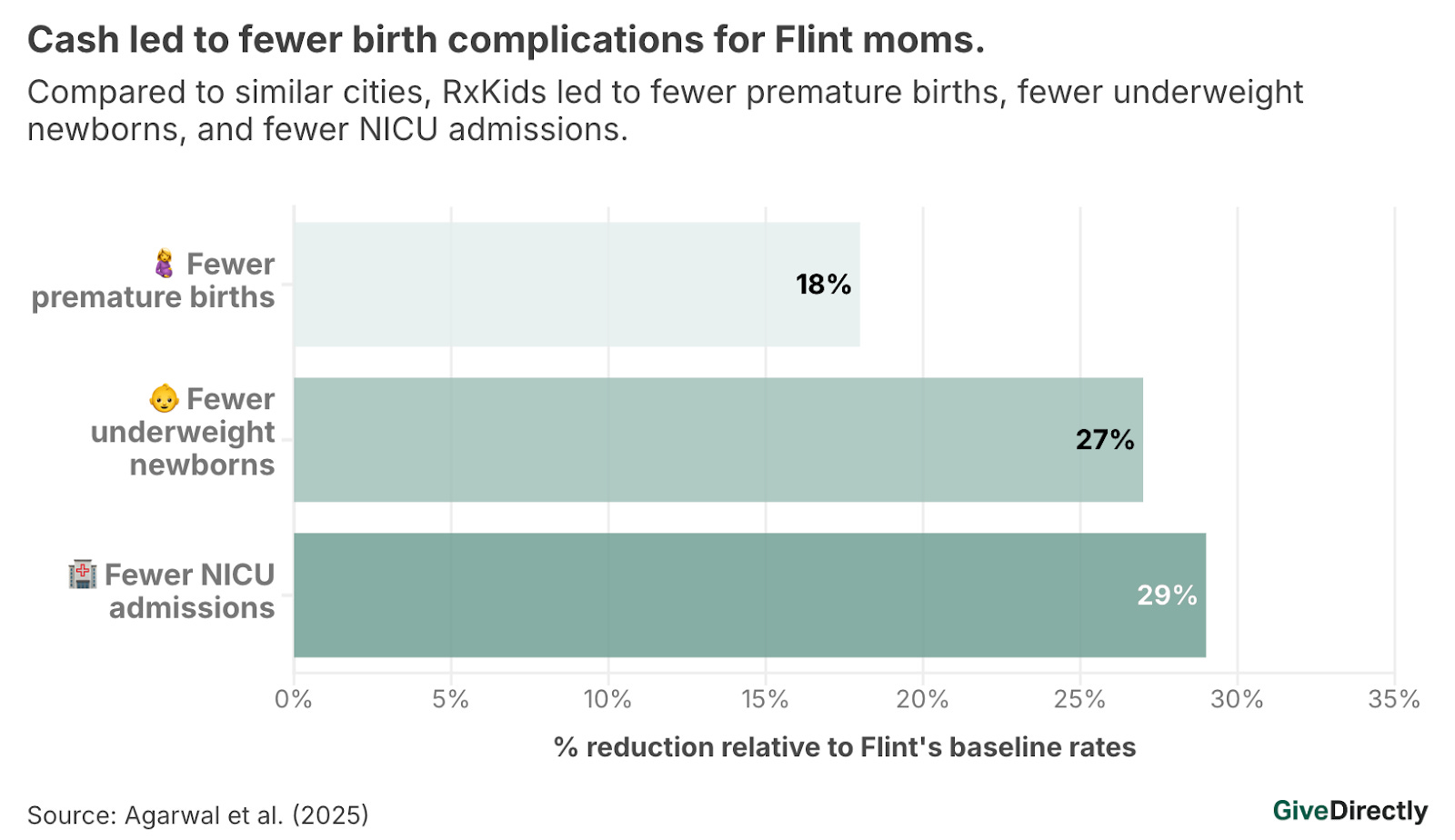 The program was part of GiveDirectly’s direct cash giving program called RxKids. A statewide study of more than 450,000 births across Michigan found that in Flint premature birth rates fell by up to 18%, low birth weight births dropped by up to 27%, and millions of dollars in healthcare costs were reduced compared to similar cities that did not have an RxKids program. In another study of RxKids researchers found the program nearly eliminated evictions, reduced housing debt, and gave families the security to buy the food they wanted.
