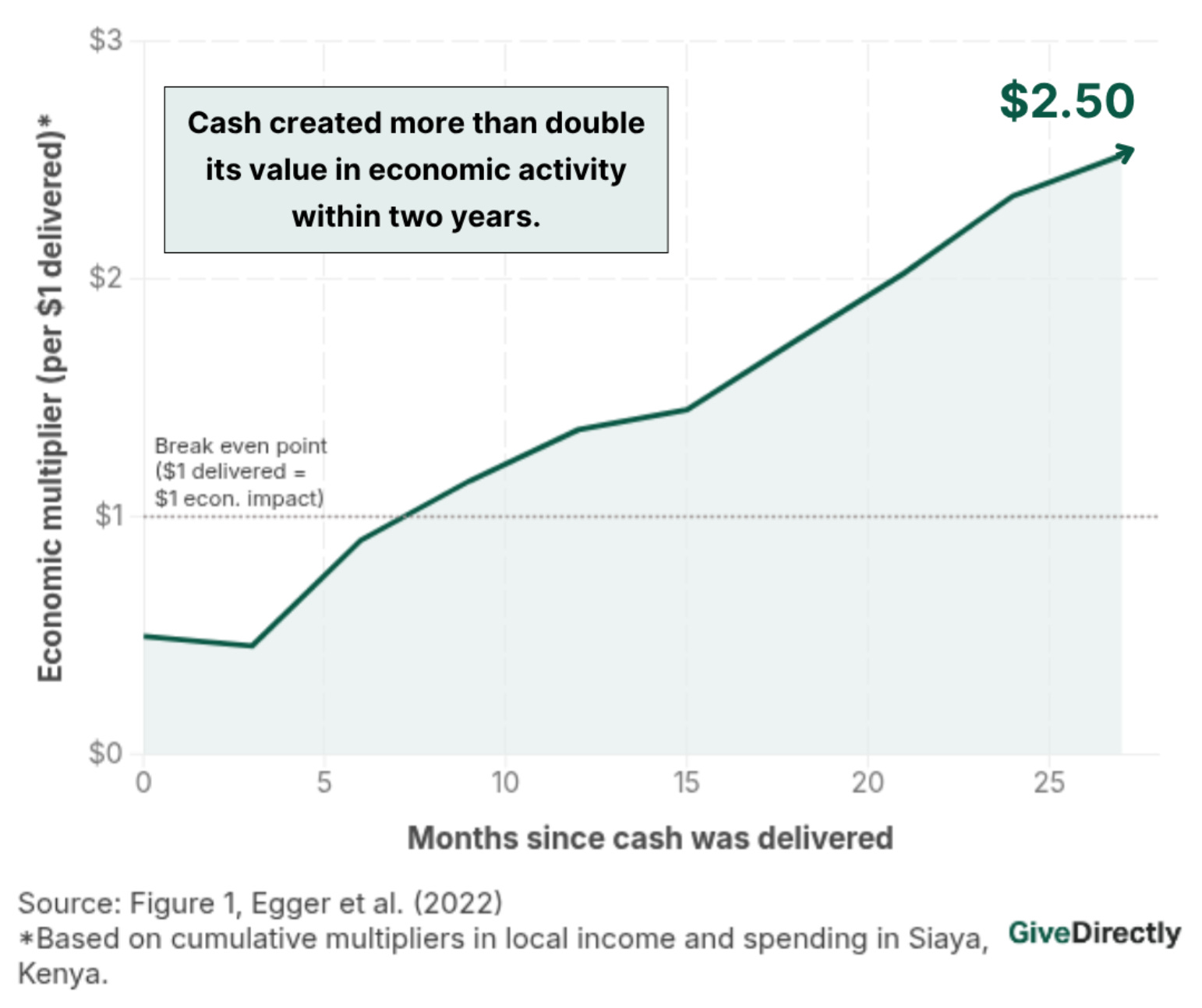 Direct cash giving isn’t only good for the families receiving money, it also can uplift the entire economy of a region. Direct cash programs have found that when people have more funds, they are more likely to start businesses, more likely to buy goods from other local businesses which can spur their growth, and more likely to invest in children and education which further accelerates the flywheel. All of this spending creates a “multiplier” effect on a local economy, which multi-year long studies covering tens of thousands of people showing that every $1 delivered had doubled its value into $2.50 in new economic activity.