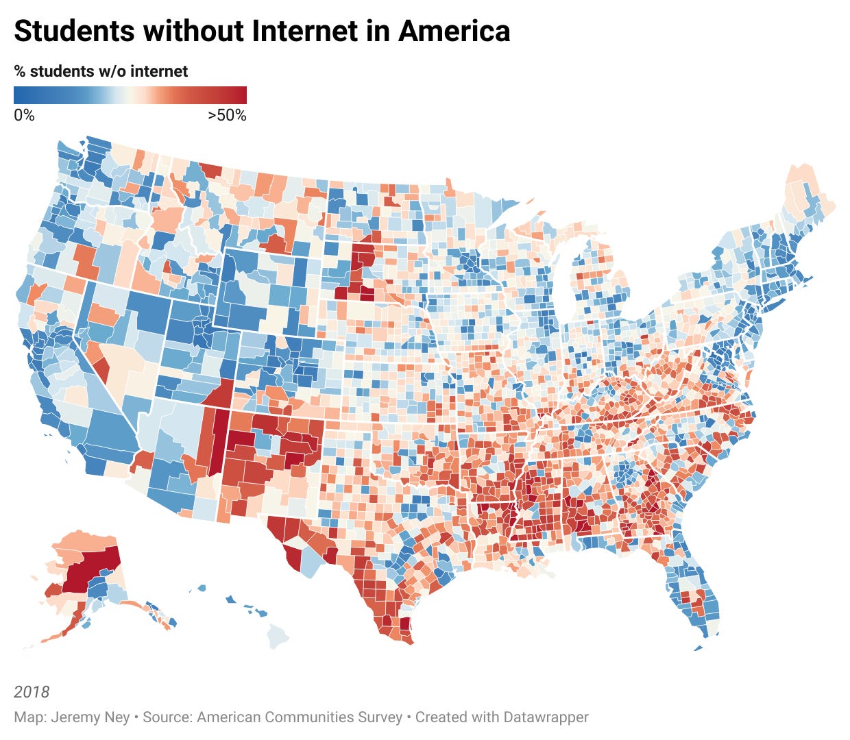 Students in low-income communities suffer the most. In Robeson County, North Carolina, the median income is $33,679, putting it in the poorest 5% of all counties, but students spend weeks trying to get WiFi hotspots to turn in homework. 43% of the county’s 27,000 students have no internet. In November, the New York Times interviewed a school superintendent in Robeson who said this about unaffordable access and lack of cell towers: “It’s un-American. I can’t wrap my head around the fact that we live in a place where you have all this technology, yet we have families who can’t access the internet in the comfort of their home.”