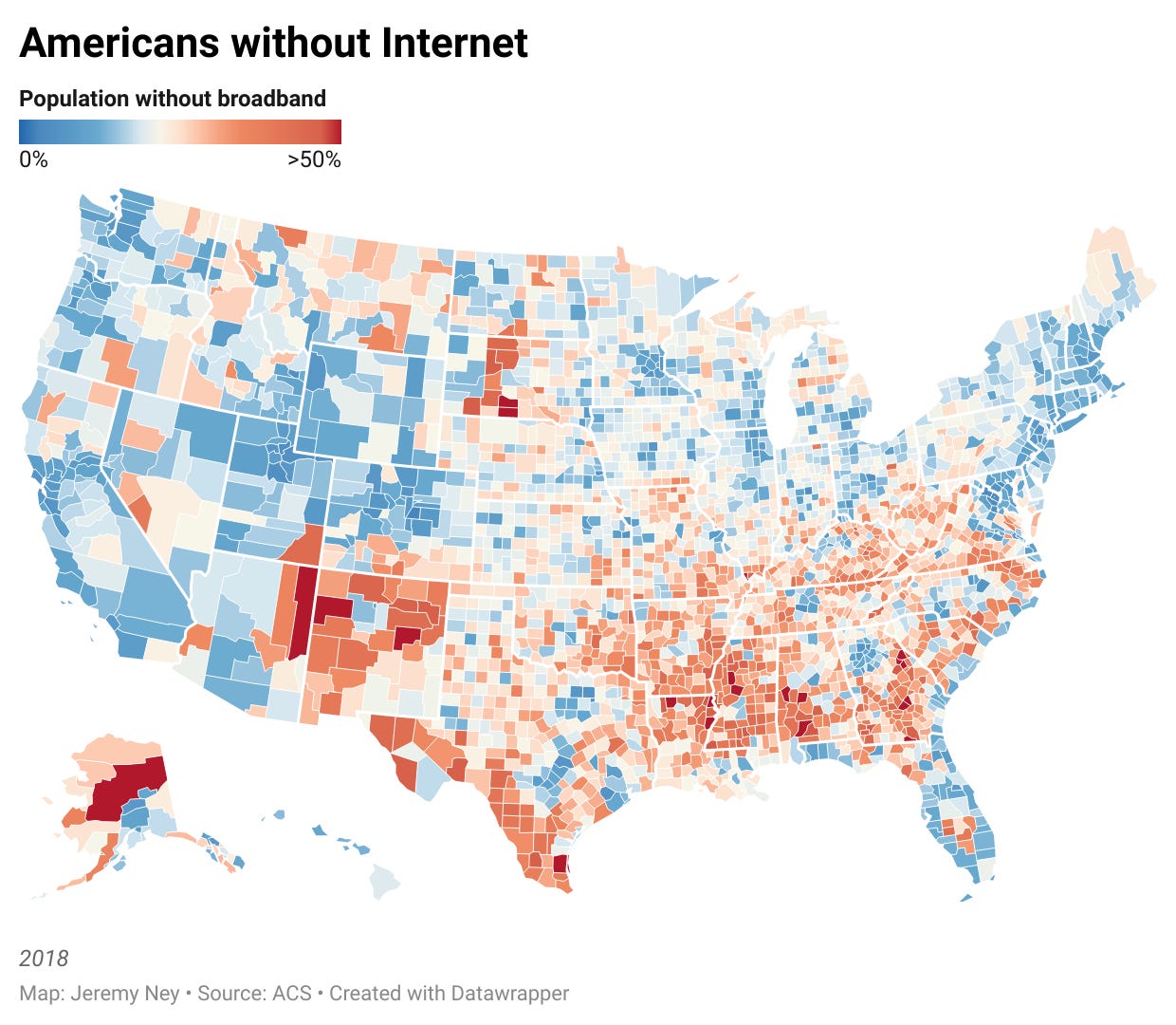 Low-income communities are the least connected in America. New data analysis reveals a 75% correlation between median household income and broadband access across all US counties. Many of these regions tend to be rural or tribal regions where there are fewer jobs and less public infrastructure. A child born into a county with a median income of $35,000 has a coin-flip chance of having any internet connection.