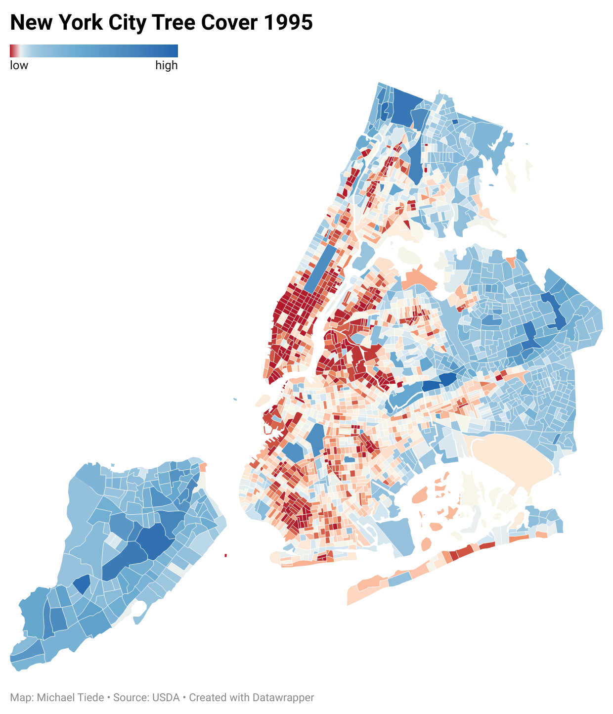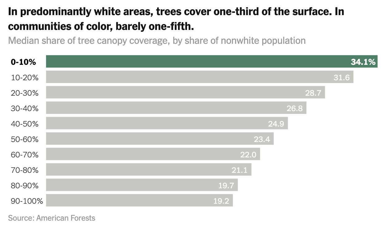 Neighborhoods with a majority of people in poverty have 25 percent less tree canopy on average than those with a minority of people in poverty. There is an emerging body of research from the U.S. Forest Service and others that has found a direct relationship between tree canopy today and red lining policies of the past. As journalists from Grist identified: