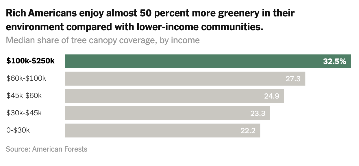 Rich Americans enjoy almost 50% more greenery in their environment compared with lower-income communities.