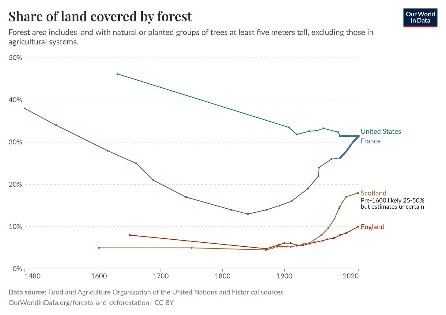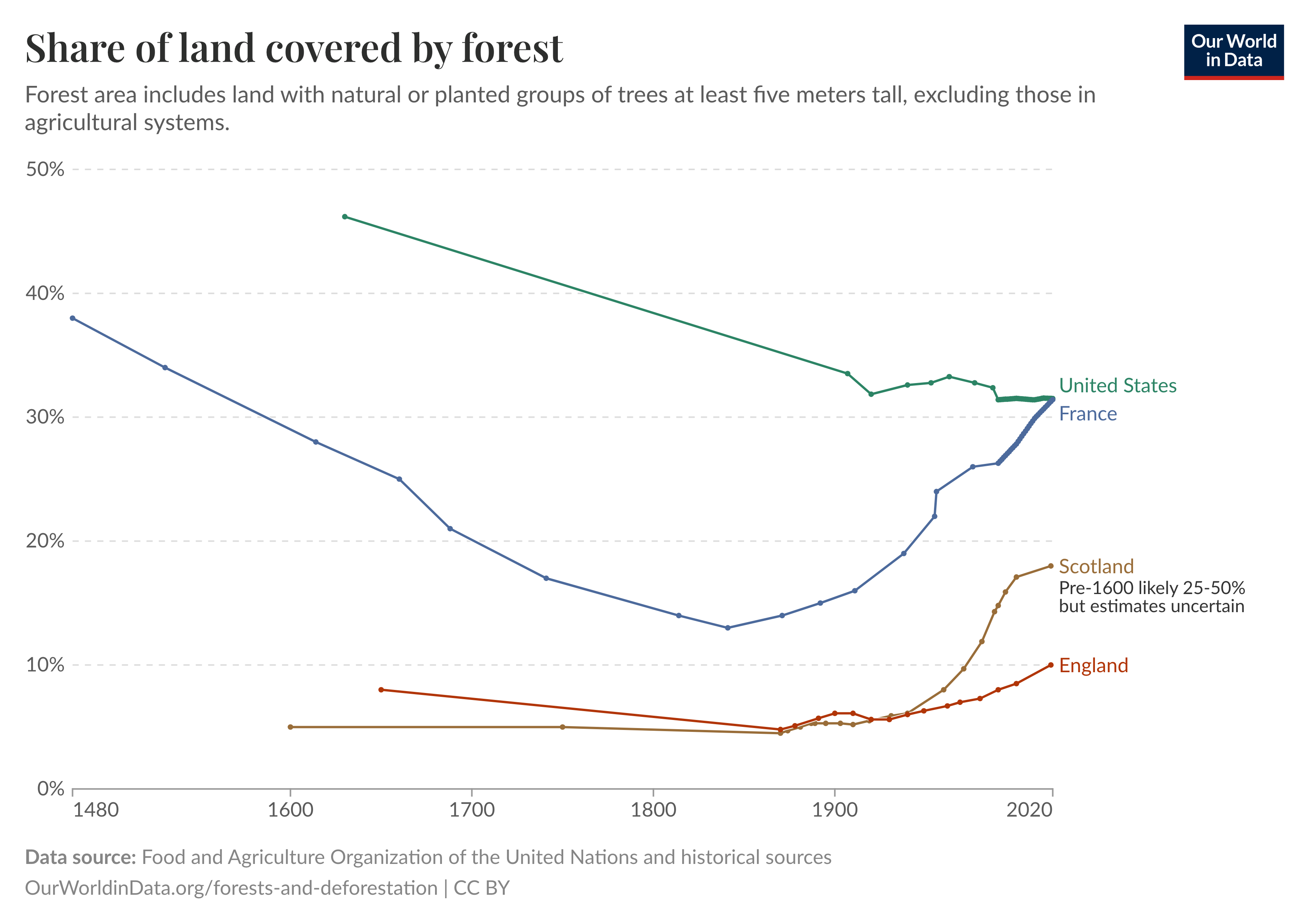 The U.S. is also an outlier globally. Many other nations like France, Scotland, and England have managed to increase their share of land covered by forest even as they developed economically. Trees and economic progress do not need to be at odds with each other. France in particularly was able to double the share of its land covered by forest from 16% in 1911 to to 32% today.